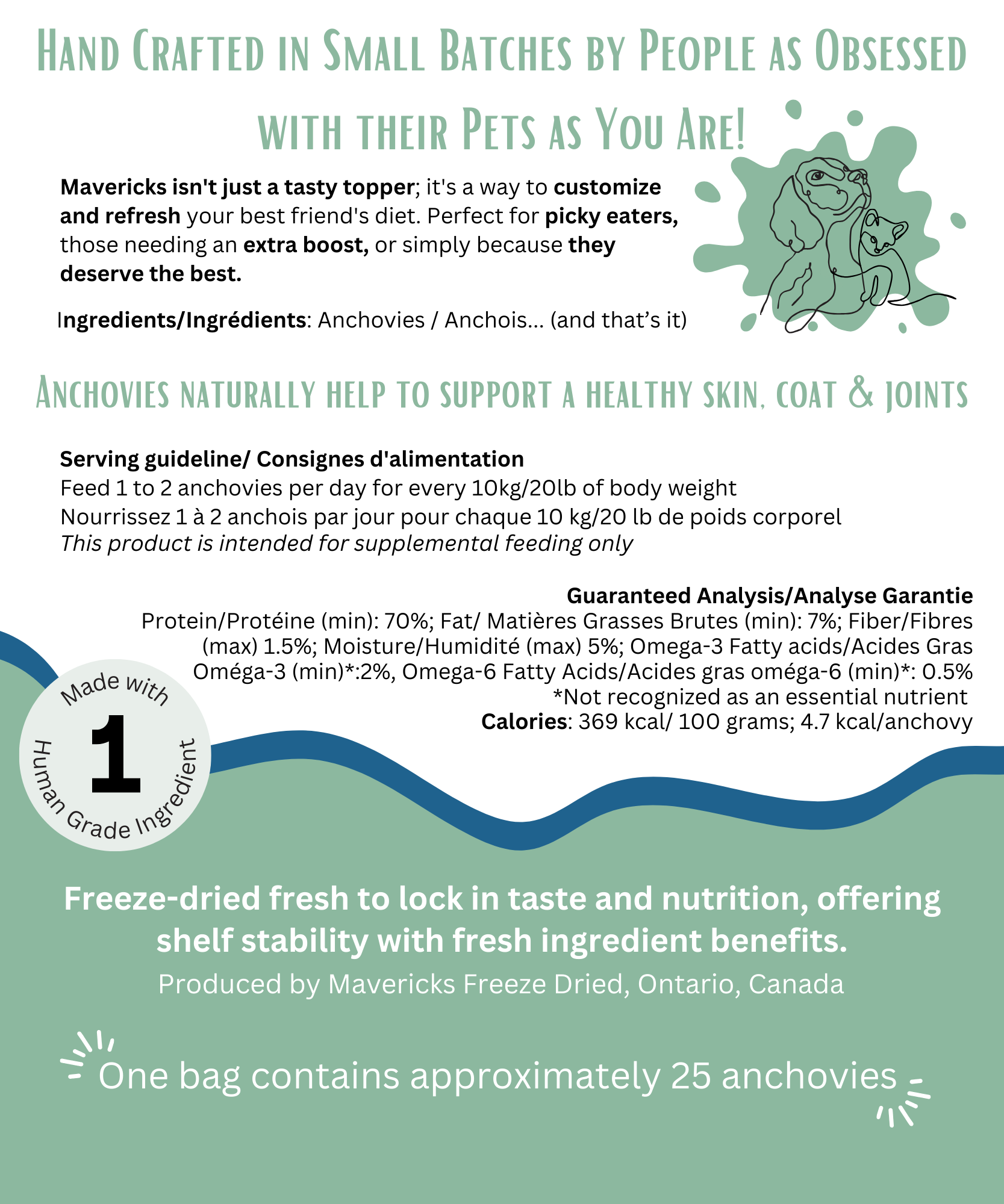 Dive into the world of natural delight with our Single Ingredient Anchovies—pure, simple, and oh-so-tasty! These little fish pack a punch of savory goodness, providing a burst of omega-3 fatty acids to support your pet's overall well-being. Our anchovies are a wholesome treat that adds excitement to mealtime or serves as a standalone snack. Each crunchy bite is a testament to the quality and care we bring to your pet's plate. Treat your furry friend to the irresistible flavor of single-ingredient goodness with our Anchovies—because sometimes, less is truly more!