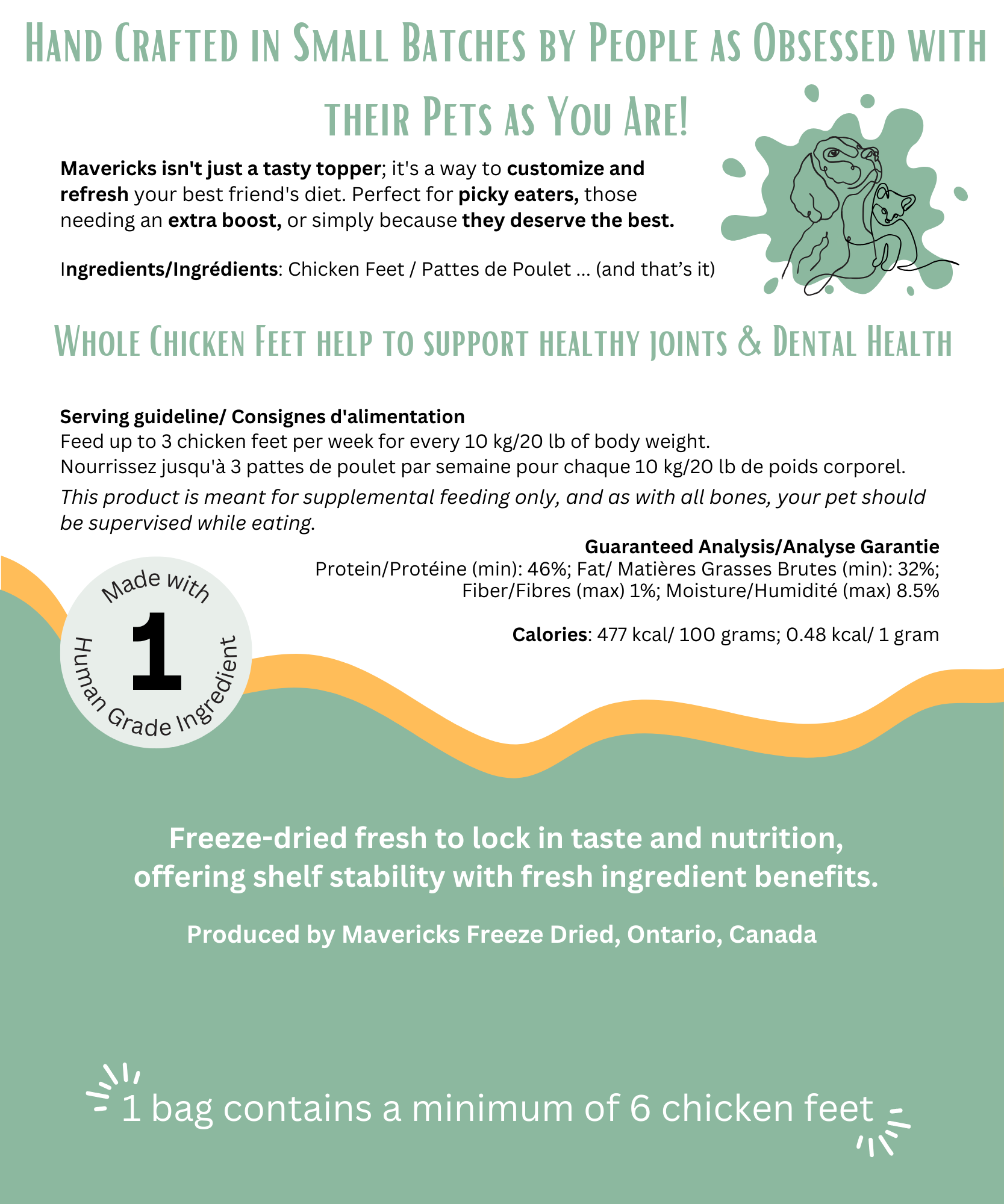 Boost your pet's joint and dental health with our Single Ingredient Whole Chicken Feet! Made from 100% human-grade chicken feet sourced from free-range, antibiotic-free chickens, they're packed with chondroitin and glucosamine to support healthy joints. Plus, whole chicken feet act as natures toothbrush by removing plaque as your furry friend chews on this delicious topper.