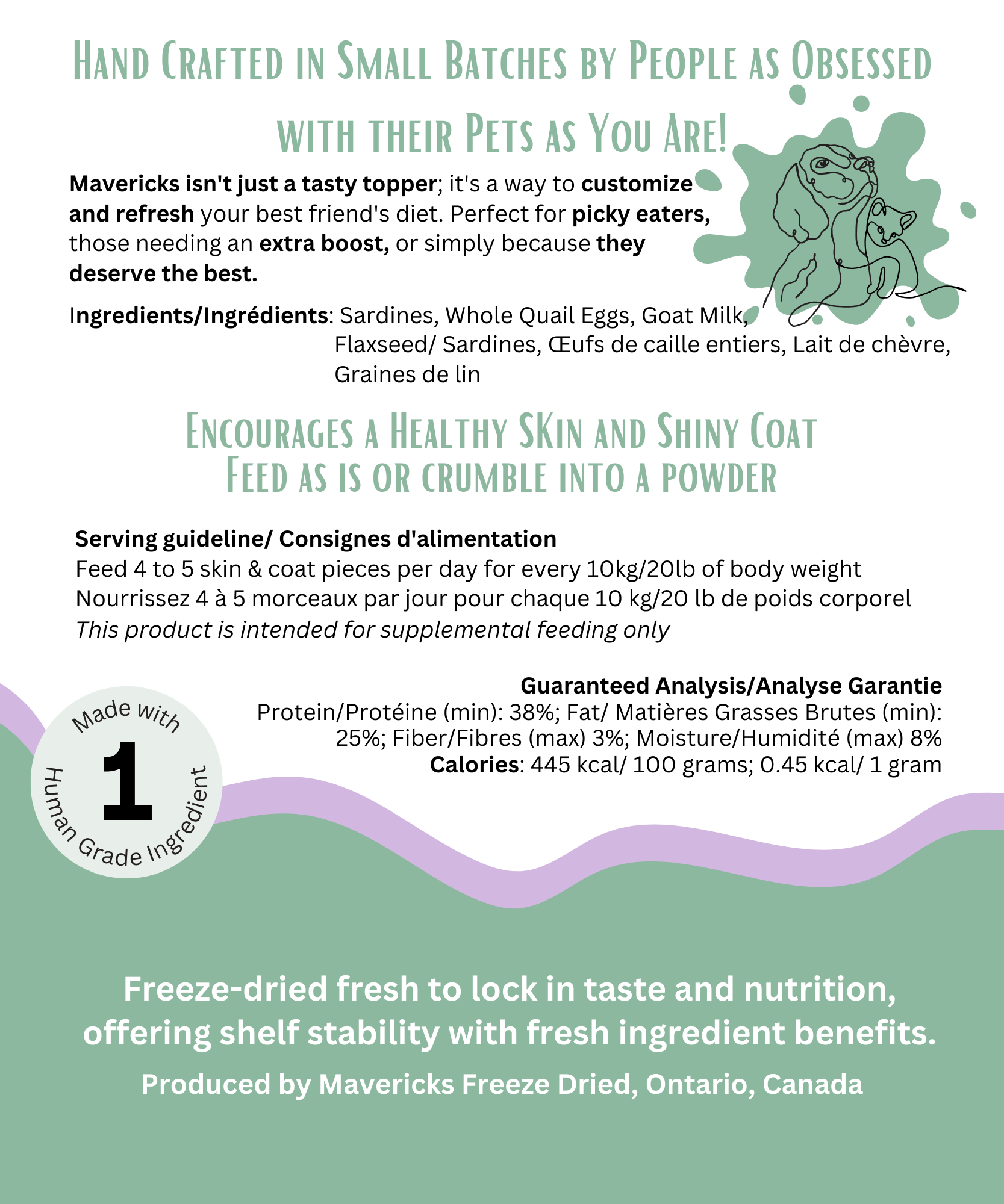 Introducing our Skin and Coat Support Topper—an exceptional blend crafted to keep your pet's fur glossy and skin healthy! This delectable topper combines the goodness of sardines, flaxseed, goats milk and whole quail eggs to create a savory symphony of flavors and skin-nourishing power. Packed with high-quality protein from sardines and quail eggs this topper supports overall health and vitality. Goat milk adds a creamy touch, providing calcium and probiotics for overall well-being, while salmon oil and flaxseed ensure a boost of omega-3 fatty acids for a lustrous coat and healthy skin. Handcrafted in small batches with love, our Skin and Coat Support Topper is the paw-fect addition to your pet's mealtime, promoting not just taste but the radiance of a healthy coat and skin. Elevate your pet's dining experience and let the joy of a glossy coat shine through in every delightful bite!